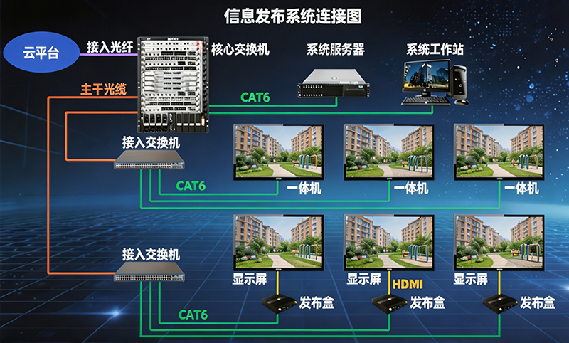 在弱电智能化工程中,信息发布系统是建筑内公众信息传递、商业广告展示及应急通知发布的重要平台,广泛应用于商业综合体、交通枢纽、医院、学校等场所。东莞监控公司围绕信息发布系统的工程内容进行梳理,涵盖系统架构、显示终端选型、播放控制、内容管理及系统联动等方面。 一、系统架构与网络设计 信息发布系统通常采用“中心服务器—播放终端—显示设备”的三层架构。中心服务器负责内容存储、节目编排及终端管理;播放终端接收服务器指令并输出至显示设备;显示设备包括液晶屏、拼接屏、LED大屏等。 系统网络宜采用独立的局域网或利用建筑内现有综合布线网络。播放终端与服务器之间通过TCP/IP协议通信,单个1080P视频流的推荐带宽不低于4Mbps。对于多楼层、大面积覆盖的场景,需划分VLAN以隔离广播风暴,并为每个播放终端分配固定IP地址。室外或远距离部署的终端可采用光纤或工业无线网桥接入。